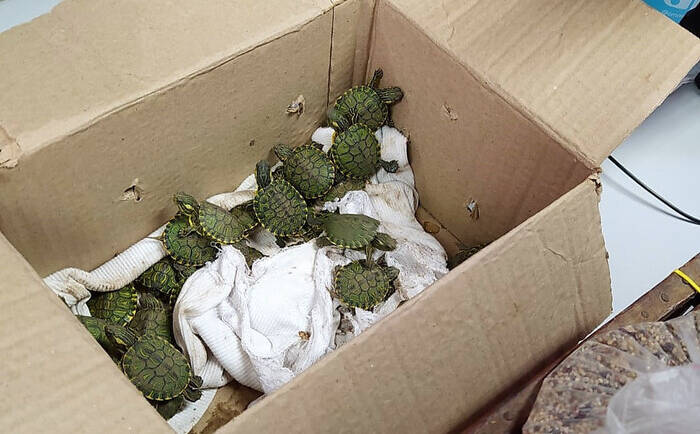 Segundo a PRF, os animais, da espécie tigre d’água, estavam sendo sendo transportados em uma caixa de papelão no banco transeiro de um Ford Ka com placas de São Paulo.