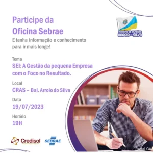 Será realizada no dia 19 de julho (quarta-feira) uma oficina promovida pelo Sebrae e Credisol em parceria com Prefeitura de Balneário Arroio do Silva, por meio da Secretaria de Turismo, Indústria, Comércio. Será oferecida gratuitamente a oficina: SEI – A Gestão da pequena Empresa com Foco no Resultado.