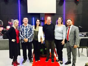José Eckert e Eloana Casagrande oficializaram casamento na Igreja Mais Cristo. No registro com os padrinhos Nado e Silvana Esmeraldino e os pastores Cristiano e Nilceia Moraes.