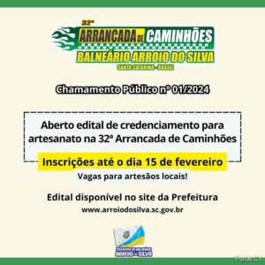 Está aberto o edital de credenciamento dos artesãos para exposição na 32ª Arrancada de Caminhões, que acontece de 22 a 25 de fevereiro, no Parque de Arrancadas, em Balneário Arroio do Silva. As inscrições iniciam nesta quinta-feira, 1º, e seguem até o dia 15 de fevereiro. Serão disponibilizadas até 15 vagas para artesãos do Balneário Arroio do Silva, durante os quatro dias de evento, gratuitamente.