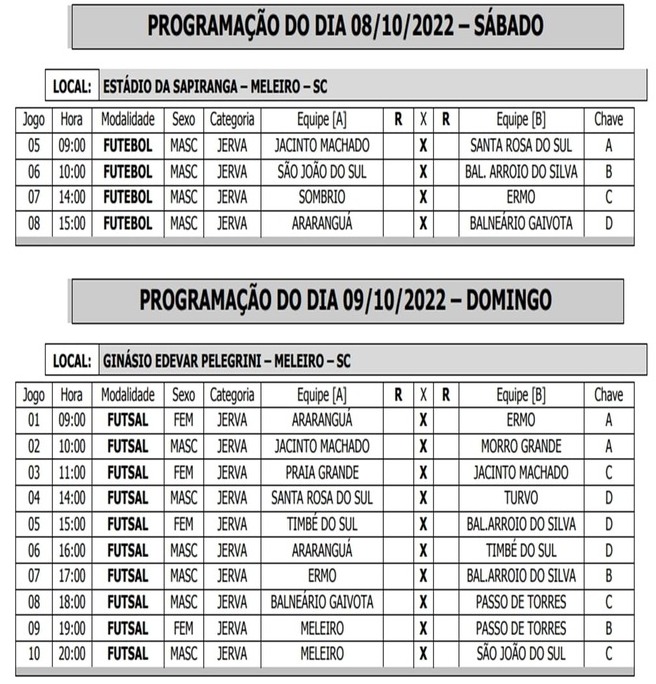 No primeiro dia de JERVA, as competições iniciaram pela manhã, no Estádio Ézio Pelegrini, com jogos de Futebol. No Sub15, Turvo venceu Ermo por 2 a 0; Praia Grande venceu Gaivota por 2 a 0; Praia Grande fez 2 a 0 em Santa Rosa do Sul; À noite, após a abertura oficial, no primeiro jogo da modalidade Futsal Sub17, o time de Meleiro, treinado pelo professor Dandi, conquistou uma importante vitória, ao golear a equipe de Passo de Torres pelo placar de 10 a 0. Neste final de semana, prosseguem as competições de Futebol, no Estádio do distrito de Sapiranga, no sábado e Futsal no Ginásio de Esportes Edegar de Pelegrini.