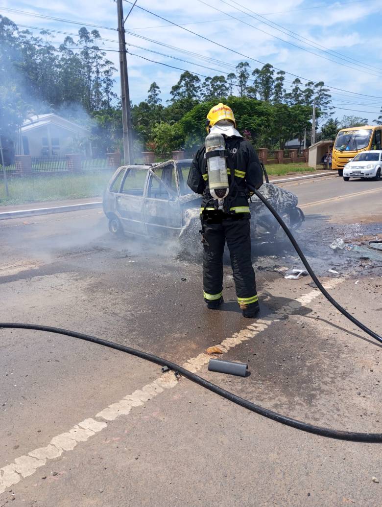 Na manhã desta sexta-feira (23), por volta das 11h40, a guarnição do Corpo de Bombeiros fora acionada para combater um incêndio de veículo. Ao chegarem no local, porém, constataram que se tratava de um acidente de trânsito seguido de incêndio, onde o veículo já estava completamente tomado pelas chamas.
