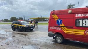 Os bombeiros foram acionados junto a CCR-Via Costeira e a PRF, que chegaram no local por conta de um atropelamento envolvendo uma Hilux Branca e uma mulher que tentava atravessar a rodovia.