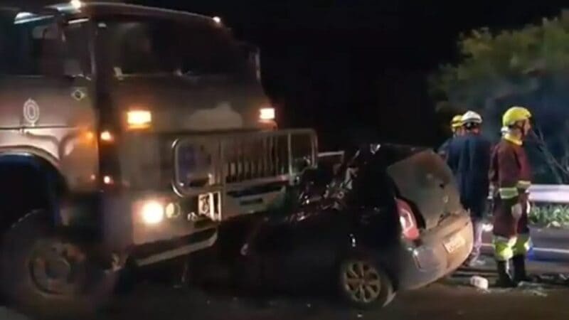 Após o impacto, o carro acabou ficou sob a dianteira do veículo militar, o que resultou na morte instantânea de três homens que estavam no automóvel.
