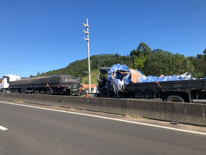 Um caminhão carregado de água colidiu na traseira de outro caminhão, causando a morte do motorista. Equipes do Samu e Corpo de Bombeiros atenderam à ocorrência, assim como a CCR Via Costeira, responsável pelo trecho.