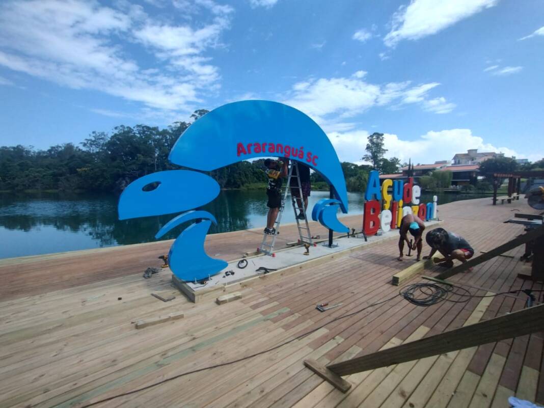 O deck de contemplação do Açude Belinzoni, em Araranguá, conta com mais uma novidade, a instalação do letreiro temático, que destaca as cores oficiais do município.
