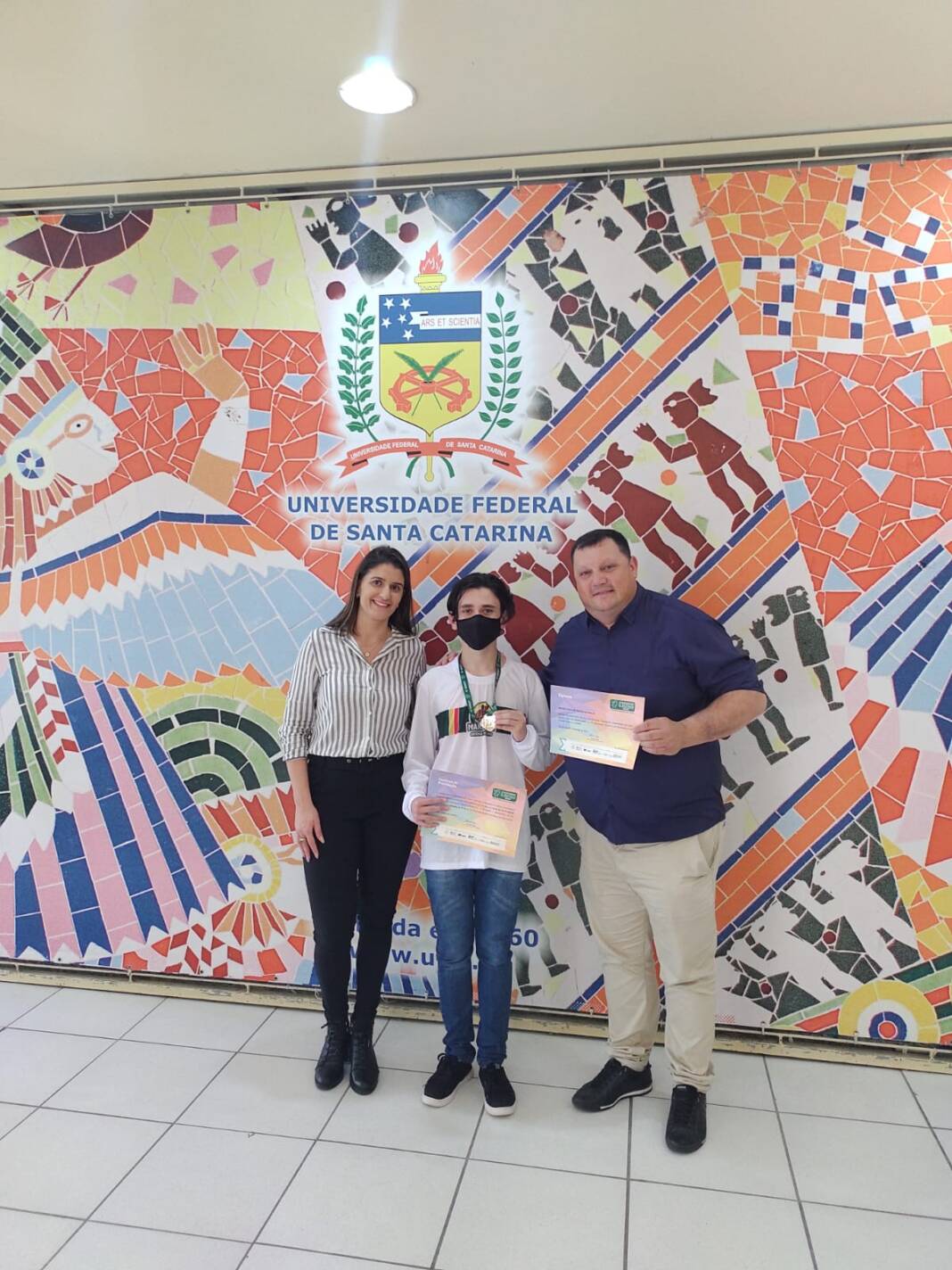 O diretor de Educação e Cultura, Daniel de Souza, e a diretora da Escola, Aline Mello Rosso, acompanharam o aluno Tales, na Capital, para receber sua medalha de prata. A premiação é celebrada. “O resultado dessa premiação reafirma o trabalho que estamos desenvolvendo nas escolas do município. Ficamos honrados em ver alunos nossos se destacando em nível nacional. Parabenizamos os alunos pelo empenho, a direção e professores pela dedicação em fazer a diferença”, disse Daniel de Souza.