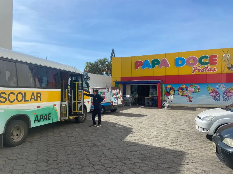 Após a visita na fábrica, foram levados, com o ônibus da Apae, até a Loja da Papa Doce Festas, localizada no centro de Sombrio, lá eles aprenderam sobre a parte de compras e vendas dos produtos.