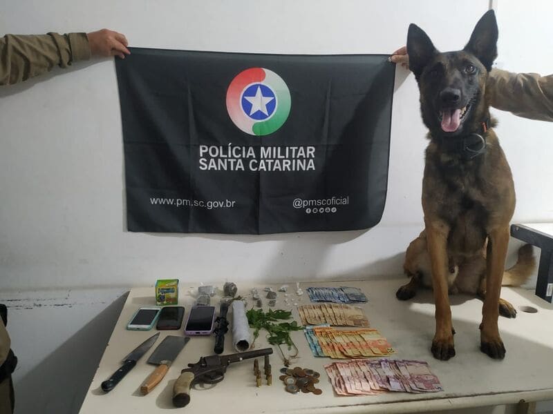 No local a viatura do Tático efetuou a varredura inicial e posteriormente a guarnição do K9 empregou o cão Argo para buscas, sendo encontrados um revólver calibre 45, oito munições calibre 45 intactas, aproximadamente 106 gramas de maconha, 1,2 gramas de crack, 2,2 gramas de cocaína, aproximadamente R$ 1.142,25, uma luneta para arma longa, seis rojões, duas facas e três pés de maconha.