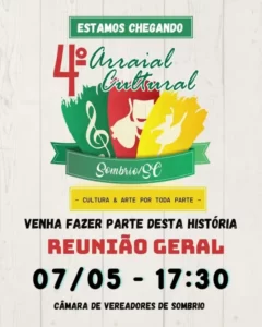 A Comissão de Organização do 4º Arraial Cultural de Sombrio convida a todos os artistas, cantores, dançarinos, artesãos, artesãos, expositores da agricultura familiar, associações, empresários e público em geral para a primeira reunião ampliada do evento. A reunião será no domingo (07/05), às 17h30, na Câmara de Vereadores de Sombrio.