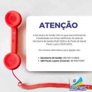 A Secretaria de Saúde informa que está enfrentando instabilidade nas linhas telefônicas da sede da Secretaria de Saúde (3526 0339) e do Posto de Saúde Paulo Lupinn (3526 0432).