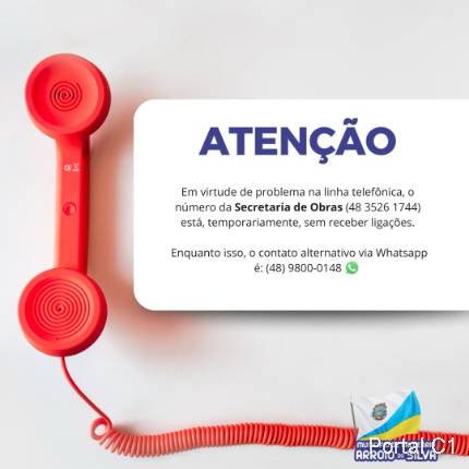 Em virtude de problema na linha telefônica, o número da secretaria de obras (48 3526 1744) está, temporariamente, sem receber ligações.