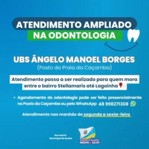 A Secretaria Municipal de Saúde de Balneário Arroio do Silva informa que o atendimento de odontologia foi ampliado na Unidade Básica de Saúde Ângelo Manoel Borges, da Praia da Caçamba, estendendo a área de abrangência. Com isso, os moradores das comunidades entre Stellamaris e Lagoinha serão atendidos no Posto da Caçamba e podem realizar o atendimento odontológico presencialmente ou via WhatsApp: 48 998271308. “A ampliação do serviço de odontologia era uma necessidade e agora torna-se realidade. Antes os pacientes precisavam se deslocar para o posto de saúde Valter Oliveira, o que sobrecarregava o serviço na unidade. Agora os moradores podem ter o atendimento mais próximo de sua residência e de maneira mais ágil”, registrou o secretário de saúde, Rogério Ferreira da Costa Junior.