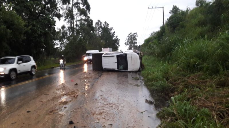Um capotamento foi registrado nessa quinta-feira na SC-108, localidade de Rio Maior, em Urussanga, logo após a passagem das chuvas e ventos fortes que ocorreu na cidade.