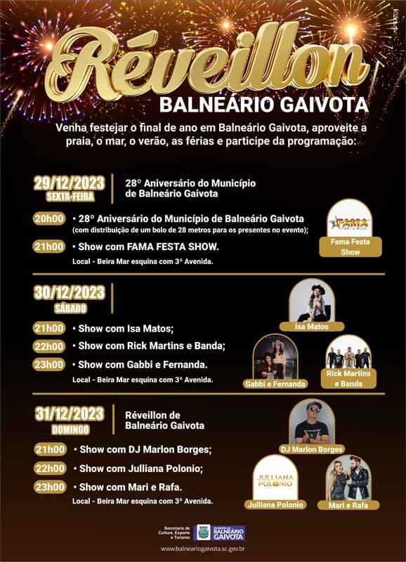 A festa da virada vai começar às 21 horas, no palco da 3ª Avenida, com show do DJ Marlon Borges; 22h show com Juliana Polonio e 23h show com Mari e Rafa. Venha festejar o final de ano em Balneário Gaivota, aproveite a praia, o mar, o verão, as férias e participe da programação.