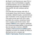 Na sua página do Instagram, a Professora de Educação Física para mensagem para os gringos de Balneário Gaivota: “Sim povo, estamos no #BBB23! A Lari está oficialmente na casa mais vigiada do Brasil e nós ficamos por aqui com o coração cheio de felicidade e orgulho. A Larissa Santos, Lari ou Larry para os international gringos from Balneário Gaivota/SC vai com certeza cativar vocês”. Larissa também faz um pedido aos fãs para que coloquem o seu hashtag #larissasantosnoBBB23 para trabalhar, se junte ao mutirão do polvo e divirtam-se com a nossa Lari. #bbb23 #globoplay #teamlarissasantos #laribbb23 #mutiraodopolvo