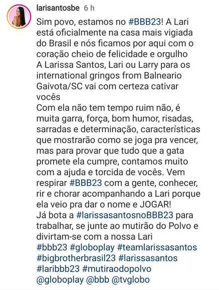 Na sua página do Instagram, a Professora de Educação Física para mensagem para os gringos de Balneário Gaivota: “Sim povo, estamos no #BBB23! A Lari está oficialmente na casa mais vigiada do Brasil e nós ficamos por aqui com o coração cheio de felicidade e orgulho. A Larissa Santos, Lari ou Larry para os international gringos from Balneário Gaivota/SC vai com certeza cativar vocês”. Larissa também faz um pedido aos fãs para que coloquem o seu hashtag #larissasantosnoBBB23 para trabalhar, se junte ao mutirão do polvo e divirtam-se com a nossa Lari. #bbb23 #globoplay #teamlarissasantos #laribbb23 #mutiraodopolvo