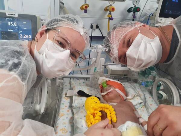 João nasceu no dia 11 de dezembro 2021, teve dificuldade para respirar e já foi para a UTI. O pai assistiu o parto. “Já tinha sentido a primeira emoção do dia: ALEGRIA. Depois fui ver o João na UTI. Ele estava sedado e entubado. Parecia morto. Tive a segunda emoção do dia: TRISTEZA. Umas 8 horas da noite fui sozinho à UTI ver o João. Nesse momento ele estava entubado, mas acordado, com os olhinhos bem abertos. Tive a terceira emoção do dia: a ESPERANÇA. “, postou o pai.