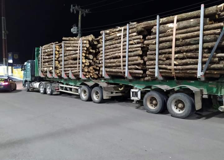 O Volvo placas de Caxias do Sul/RS transportava toras de pinus. O auto de infração gerou multa de R$ 2.098,00 ao transportador. O motorista somente seguiu viagem após a carga excedente ser transbordada para outro veículo.