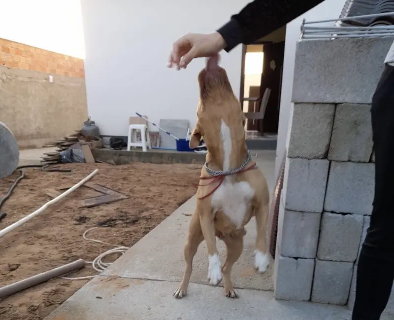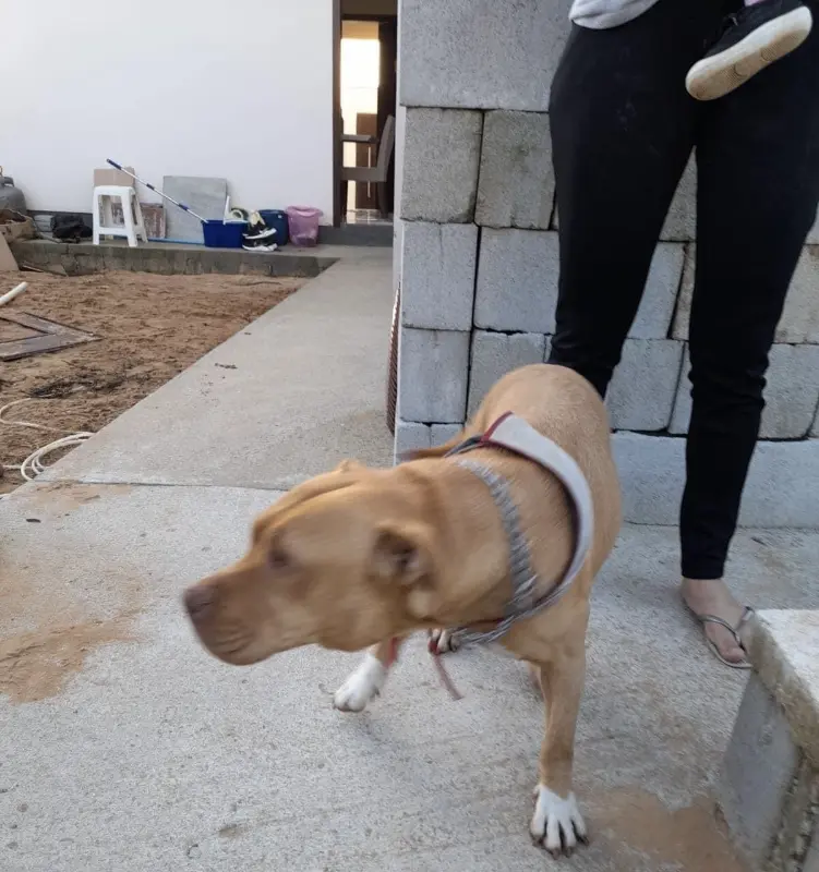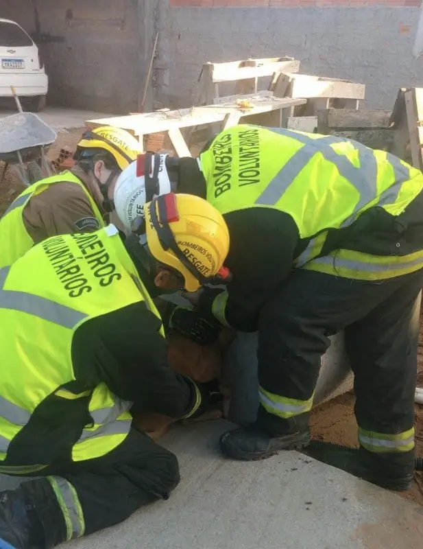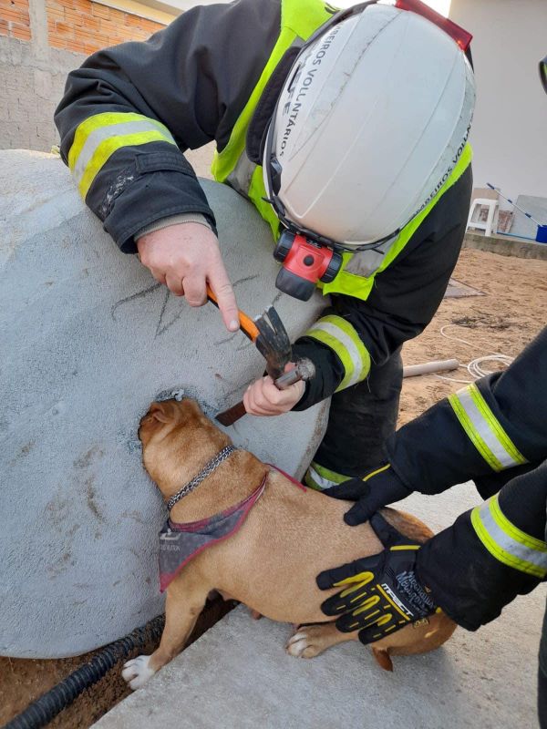 Segundo os socorristas, uma cadela da raça Pit Bull colocou a cabeça no orifício de um artefato de cimento e não conseguiu mais sair, sendo necessário o socorro.