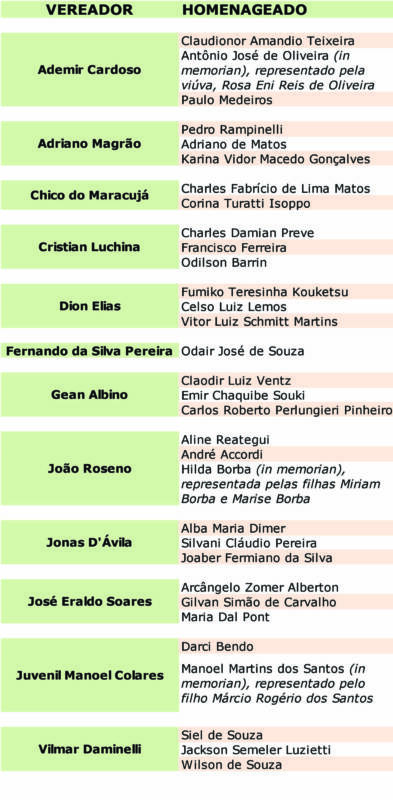 Após, cada vereador discursou, justificando suas homenagens, com exceção do vereador José Eraldo, o Peri, que ainda se recupera de um acidente e foi representado e teve seu discurso lido em plenário.