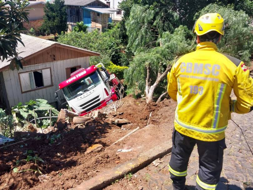 Caminhão-tanque cai em barranco e atinge casa em Videira SC
