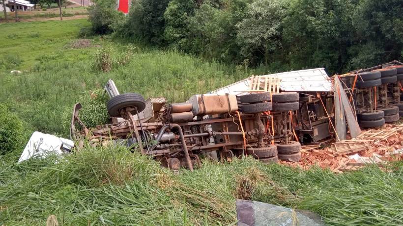 Conforme o Comando Rodoviário da Brigada Militar (CRBM), o caminhão estava carregado com tijolos e tombou no trevo de acesso ao município, depois, caiu em um barranco às margens da rodovia.