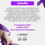 Com o tema “Violência doméstica e familiar contra a mulher”, a palestra acontecerá nos dias 10 e 17 de agosto, e terá como público principal as servidoras públicas sombrienses.