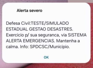 Na manhã deste domingo (1º), por volta das 9h20 e 12h50, telefones celulares de moradores de diversas regiões de Santa Catarina emitiram um alerta sonoro acompanhado de mensagem na tela informando “Alerta severo”. Logo na sequência, o aviso esclarecia se tratar de um teste/simulado estadual de gestão de desastres promovido pela Defesa Civil catarinense.