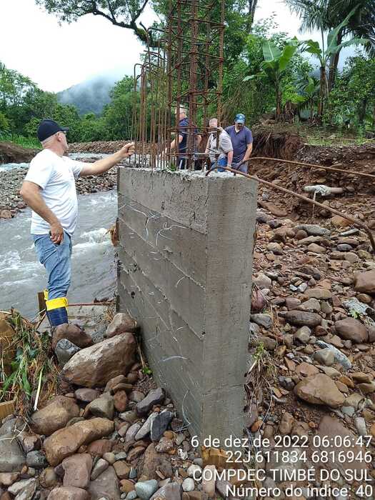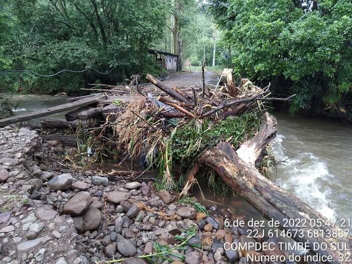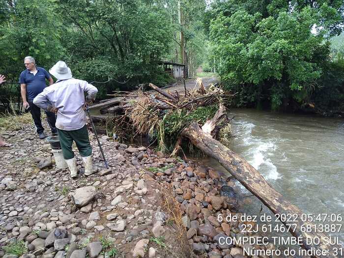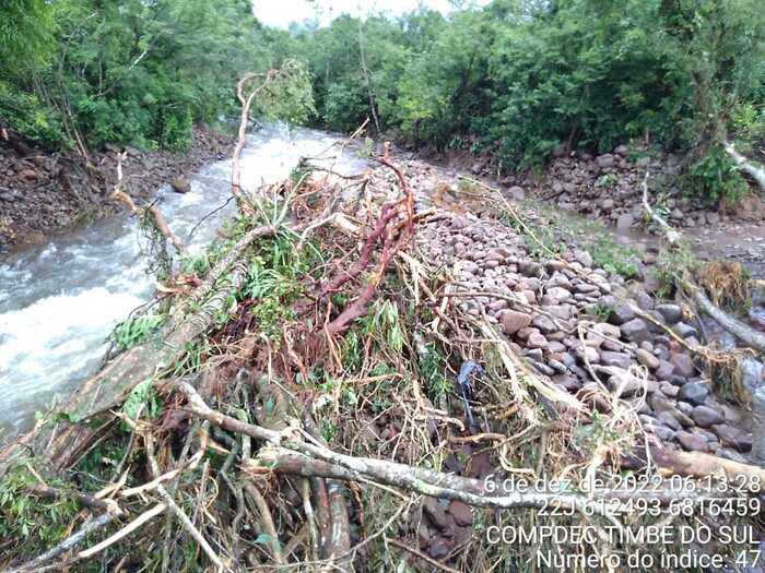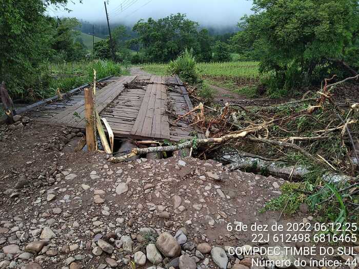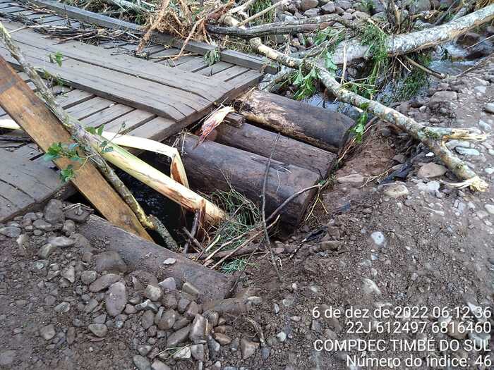 O abastecimento de água opera em situação precária em função do rompimento da rede na comunidade de Molha Coco. Foram danificadas pontes, cabeceira de ponte, valos abertos pela vazão da água, rio que mudou o trajeto e estradas com diversos danos. Equipes das Secretarias de Obras, Agricultura, Educação e Defesa Civil de Timbé do Sul tomaram providências para que todos os atingidos pela forte chuva retornassem a rotina normal. “Vamos fazer plantão para arrumar as pontes, acessos e ficar pronto o mais rápido possível porque são moradores, pessoas acamadas, escoamento de produção que necessitam do acesso urgente. Estamos com cinco máquinas trabalhando para dar todo o suporte necessário”, destacou o secretário de Obras de Timbé do Sul, Amarildo Dandolini.