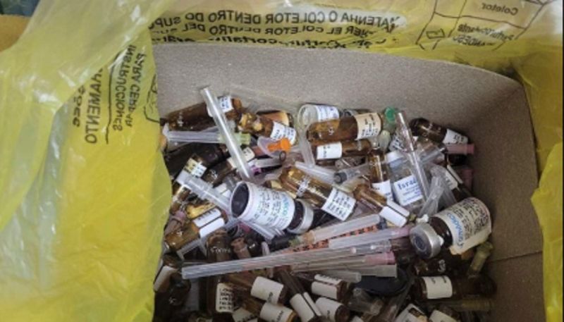 Também foram localizados no local, de forma inadequada, três caixas para descarte hospitalar de material perfurocortante com seringas, inúmeras ampolas, fios de sustentação, frascos, todos com as embalagens rompidas, e produtos irregulares como seringas com líquido, sem identificação e ampolas rompidas.
