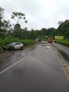 Após o dimensionamento da cena, foi solicitado apoio da PMR (Polícia Militar Rodoviária) para controle do tráfego. A condutora do veículo de passeio (mulher de 40 anos) encontrava-se consciente e sem ferimentos aparentes. O condutor do caminhão (homem de 42 anos) também estava consciente, mas apresentava ferimentos no antebraço esquerdo.