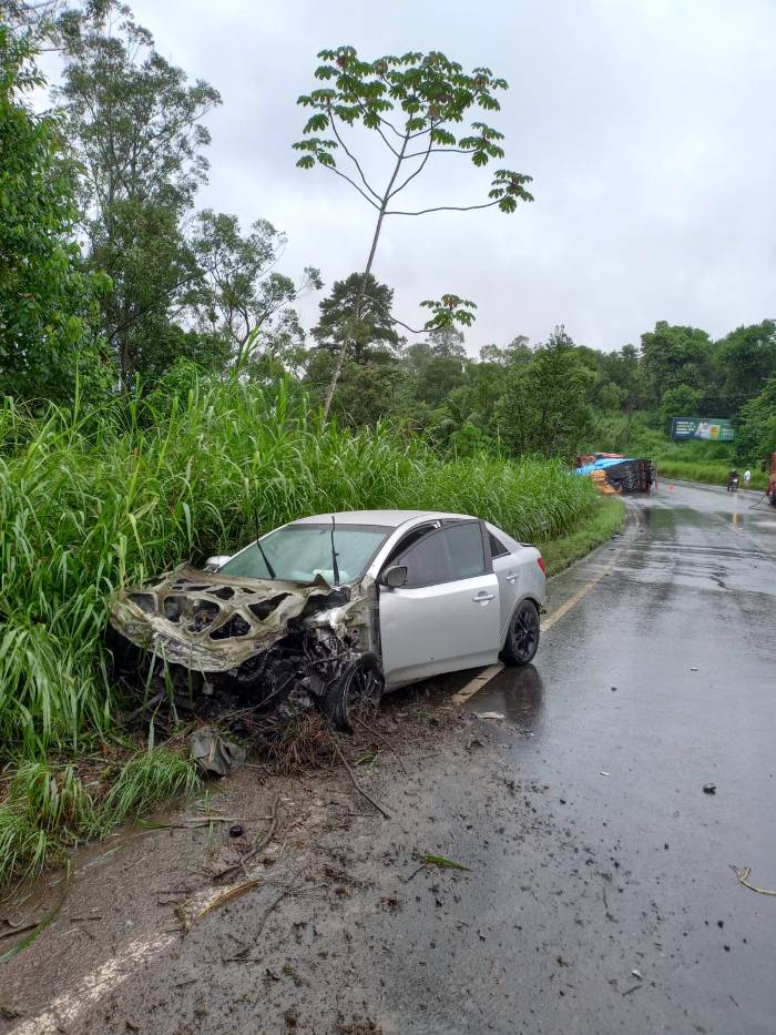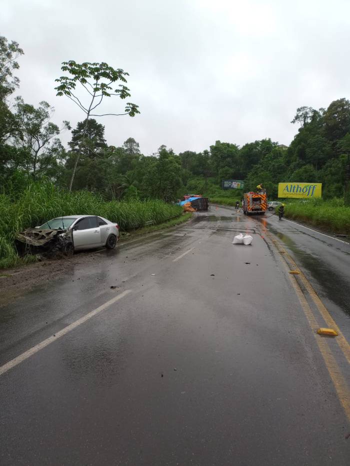 Na manhã desta terça-feira (5), por volta da 10h, na cidade de Urussanga, a guarnição do Corpo de Bombeiros foi acionada para o atendimento de um acidente de trânsito no Bairro Linha Rio Maior, sobre a rodovia SC-108. Ao chegarem no local, confirmaram a natureza da ocorrência, tratando-se de uma colisão frontal seguida de capotamento envolvendo um automóvel de passeio e um caminhão de transporte que carregava fumo.