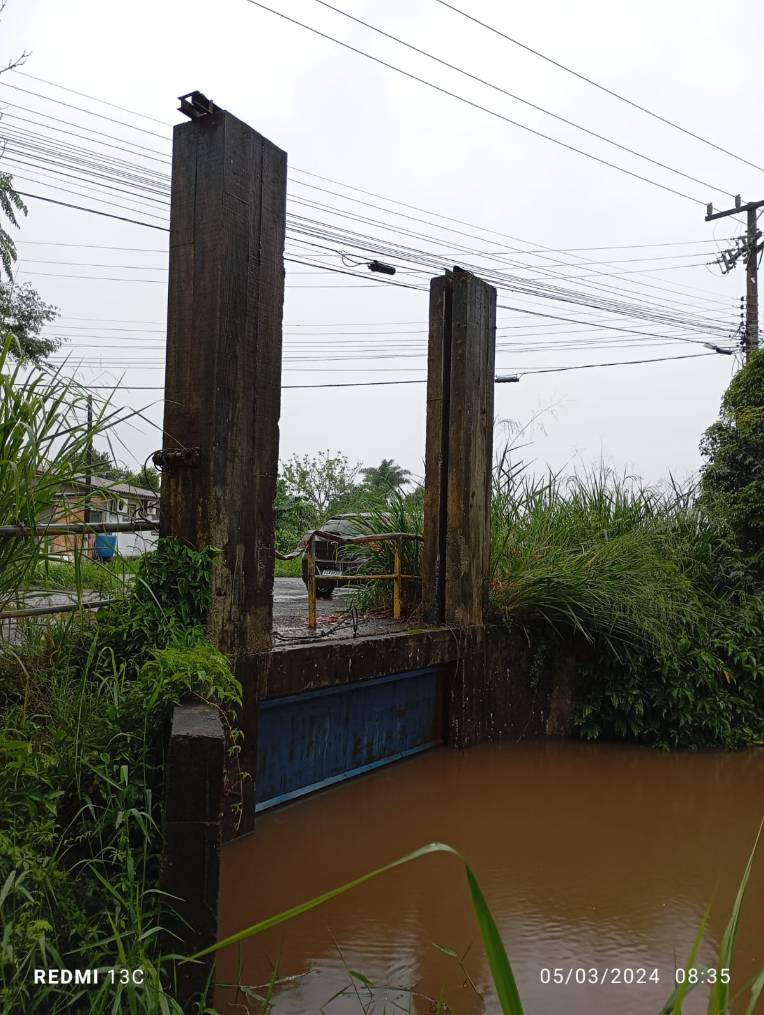 Com a interrupção das chuvas, a Defesa Civil Municipal em parceria com a Secretaria de Obras, Viação e Serviços Urbanos, providenciou a aberturada da comporta situada às margens do Rio Araranguá, na rua Paulino Luiz Pereira, no bairro Barranca.