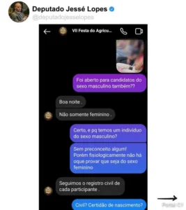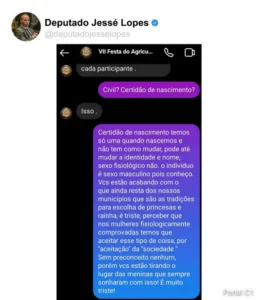 A candidata alega que tomou conhecimento de uma publicação feita de cunho transfóbico pelo deputado estadual Jessé Lopes, nas redes sociais, semanas antes. O parlamentar foi um dos jurados do concurso, que ocorreu no último dia 7.