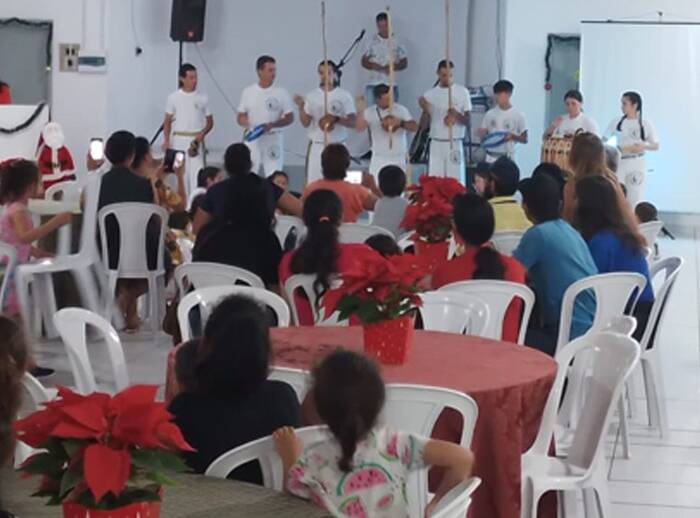 Crianças que integram oficinas, juntamente com seus familiares, participaram de evento natalino. Participaram também idosos membros de um grupo voluntário que produzem casacos, toucas e sapatinhos infantis, no projeto denominado Ato de Amor