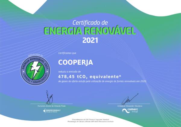 Com esta atitude a Cooperja recebe pelo sexto ano da Comerc Energia e da Sinerconsult, o Certificado de Energia Renovável 2021. O certificado é fornecido após compilação de dados pela Sinerconsult, empresa de consultoria de gerenciamento energético que desenvolveu uma metodologia exclusiva para certificar empresas que utilizam energia proveniente de fontes sustentáveis.