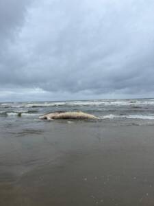 “Trata-se de uma Baleia Jubarte (megaptera novaeangliae), macho, de aproximadamente 12metros. O animal arribado na orla, possuía petrechos de pesca em sua nadadeira caudal. O que pode ter contribuído para causa da morte”, explicou Suelen Santos, presidente e coordenadora de pesquisas da Educamar.