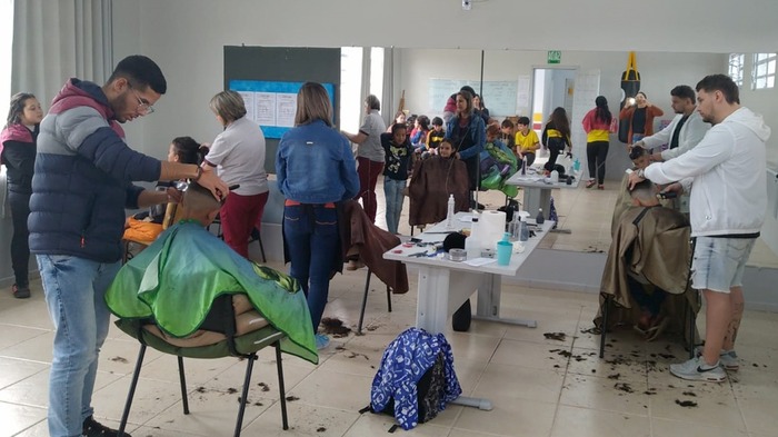 Cerca de 60 crianças e adolescentes atendidos pelo SCFV de Santa Rosa do Sul estão tendo agenda cheia durante a Semana da Criança. As várias atividades tiveram início nesta segunda, com a participação de profissionais, que realizaram o corte de cabelos para meninos e meninas. “Começamos já na segunda com estes cuidados com os cabelos das crianças, em cada um dos turnos, contando com a parceria de profissionais cabeleireiros do município”, informou a coordenadora do Cras, Cleonice Bitencourt Cabral. A atividade foi realizada com a parceria de Suzana, Bigodones, Nego, Ruan e Sandrinho, sob a coordenação de Fernanda Bitencourt, orientadora do SCFV.