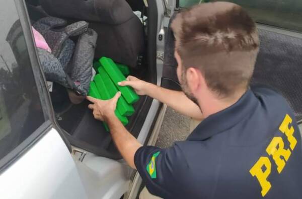Havia tabletes de maconha espalhados pelo interior do automóvel, inclusive sob a cadeirinha para transporte da criança. A mulher, de 29 anos, informou para os policiais a identidade do companheiro foragido: homem paranaense, de 33 anos, com carteira de habilitação cassada até 2029.