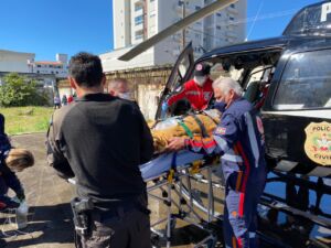 Uma criança, de 6 anos, ficou gravemente ferida após cair de um trator que acabou a atropelando, no final da manhã de quinta-feira (13) e precisou de atendimento da aeronave do Serviço Aeropolicial e Aeromédico – Saer/SaraSul.