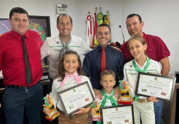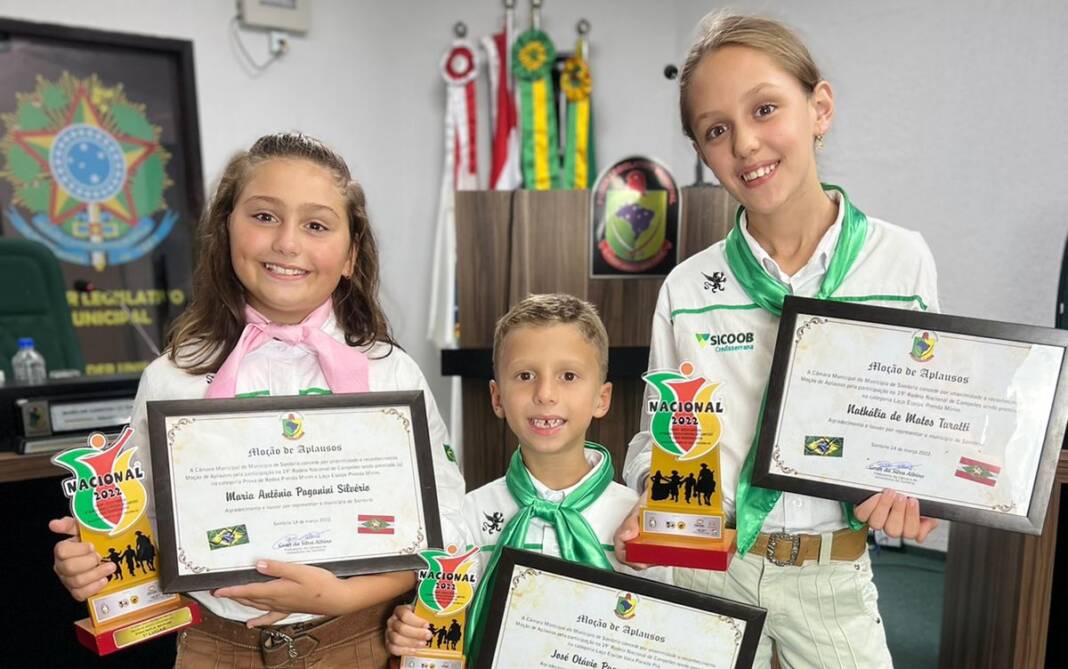 Três crianças receberam, da Câmara Municipal de Sombrio, uma Moção de Reconhecimento e Aplausos, indicada pelo vereador Gean Albino, presidente da Casa. Maria Antônia Paganini Silverio, José Otavio Paganini Silveiro e Natalia Matos Turatti representaram o município na 19ª edição do Rodeio Nacional de Campeões, realizado no CTG Pedro Raimundo em Criciúma, no mês passado.