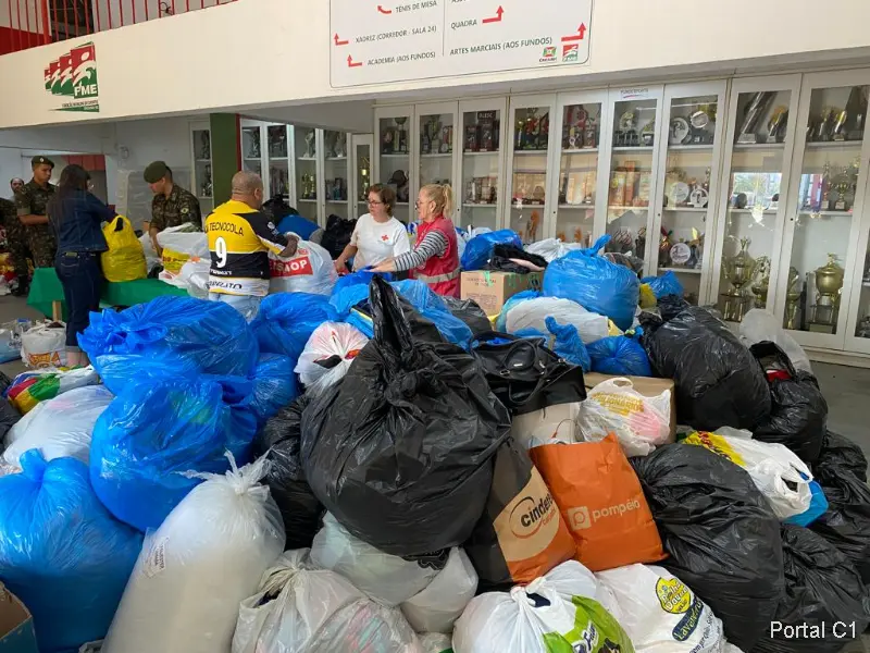 Diante da tragédia, doações foram concentradas no Ginásio Municipal Irmão Walmir Antônio Orsi, e seguiram para Porto Alegre (RS) nesta segunda-feira (11).