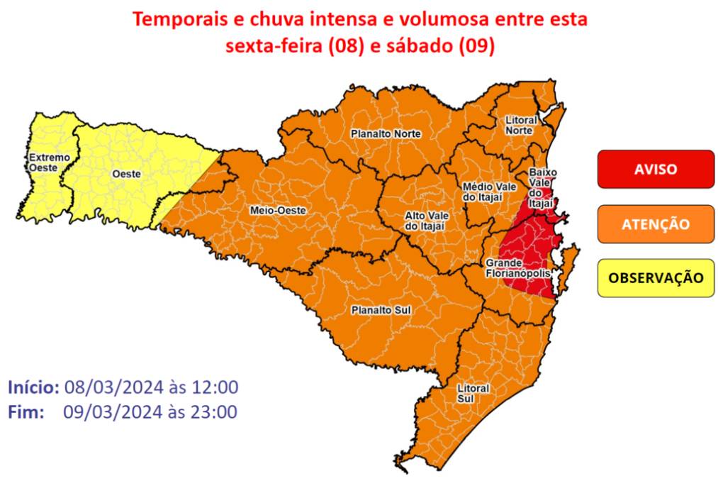 Entre o Litoral Sul, Grande Florianópolis, Médio e Baixo Vale do Itajaí e Litoral Norte, a chuva ocorre de forma mais persistente, intensa e volumosa, especialmente entre o final da tarde desta sexta (8) e a madrugada de sábado (9).