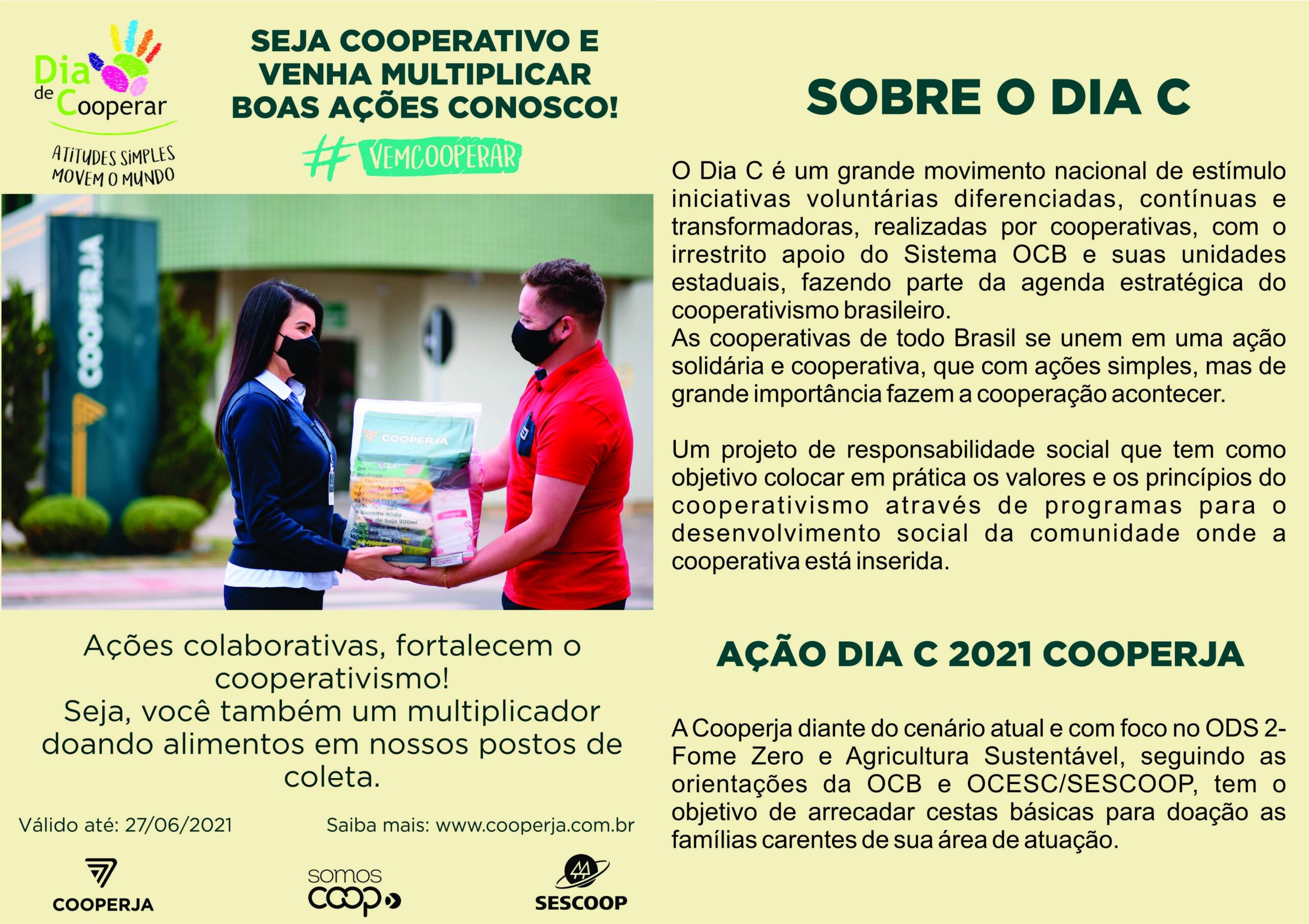 E 2021 não é diferente, novamente a Cooperja está engajada em fazer o Dia C, mais uma bela ação em prol das famílias em vulnerabilidade social, em parceria com o Ocesc/Sescoop/SC e OCB. Está recolhendo alimentos não perecíveis em todas suas unidades(Supermercados e lojas agropecuárias), que serão transformados em cestas básicas, e entregues nos municípios de sua abrangência.