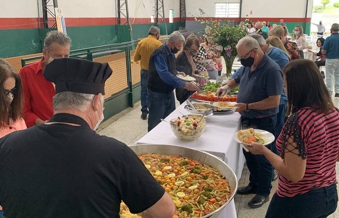 Às 11h30min os cerca de 100 idosos foram recepcionados no Pavilhão Denei Prezalino Ramos, para um almoço festivo.