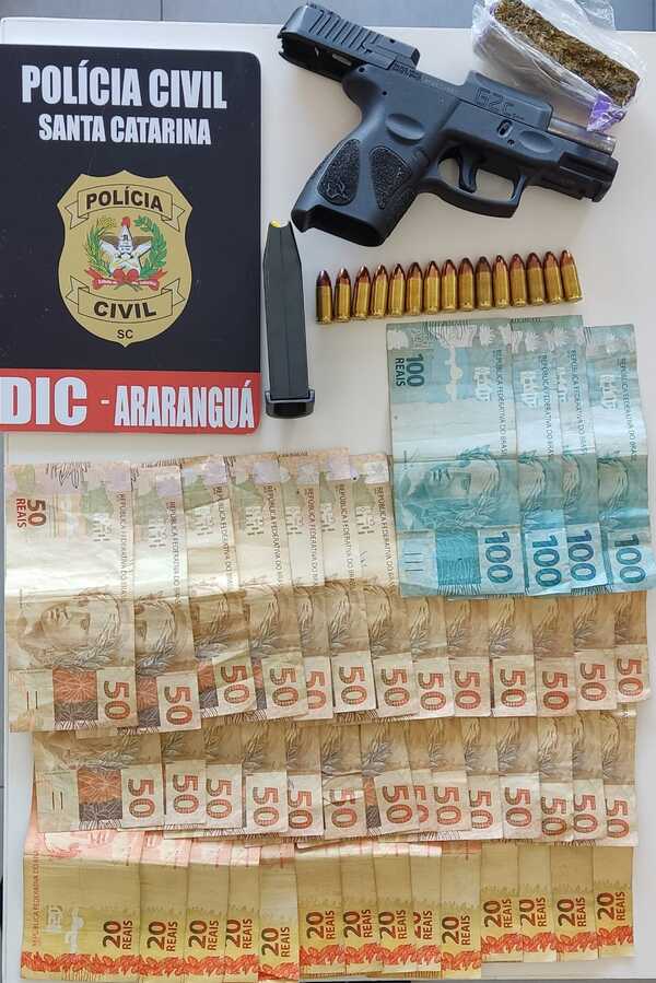 No local foram abordadas 03 pessoas, uma delas um jovem de 18 anos, morador da casa e apontado como um dos autores de um dos crimes de roubo investigados pela DIC. Durante a busca, em um dos quartos, foi encontrada uma pistola calibre 9 mm, que havia sido furtada na cidade de Chapecó/SC, um carregador e 15 munições. Também foi encontrada a quantia aproximada de R$ 2.000,00 em dinheiro e uma porção de maconha.