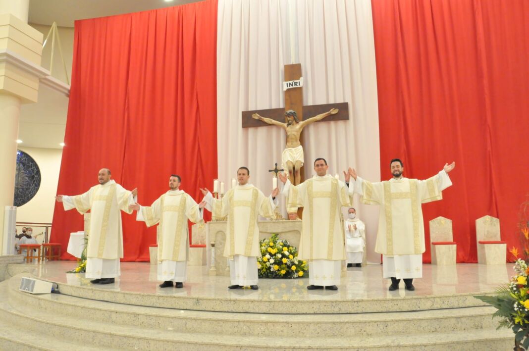 Pelo gesto sacramental da imposição das mãos e prece de ordenação do bispo diocesano Dom Jacinto Inacio Flach, os seminaristas Claiton Silva da Conceição de 33 anos, Davi Paulo Coelho 31, Fernando dos Santos de Oliveira 26, Marciel Rosa da Silva 31, e Tiago Marcelino Comin, 30 anos, receberam o ministério diaconal sob o lema ‘Fazei tudo o que Ele vos disser’, extraído do Evangelho de João (Jo 2, 5).