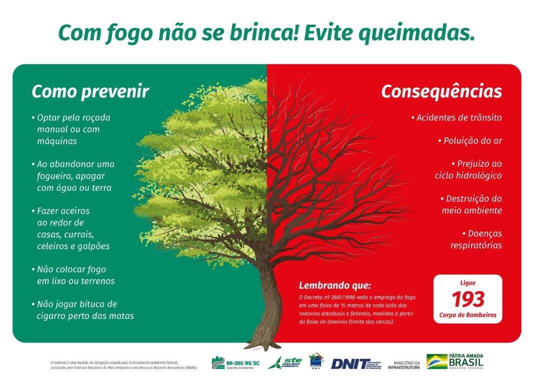 O Departamento Nacional de Infraestrutura de Transportes (DNIT) realiza uma campanha visando sensibilizar a comunidade sobre os riscos e consequências do uso de fogo nas proximidades das rodovias. Focos de queimadas foram identificados na faixa de domínio em segmentos já concluídos das obras de implantação e pavimentação da BR-285/RS/SC, em Timbé do Sul (SC), acendendo o alerta para os perigos dos incêndios.