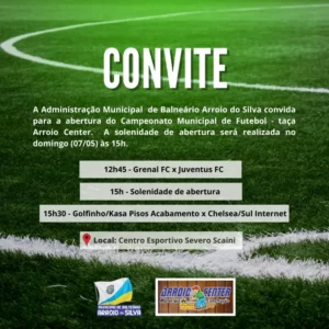 A Administração Municipal de Balneário Arroio do Silva, por meio do Departamento de Esportes, convida para a abertura do Campeonato Municipal de Futebol de Campo – taça Arroio Center. A solenidade será realizada no domingo (07) às 15h no Centro Esportivo Severo Scaini.